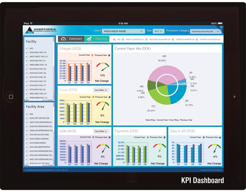 The KPI Dashboard has a set of measures designed specifically for an Anesthesia practice. At a glance, the dashboard tells you what you need to know about your business. It gives you the insight into where you are strong, where you are solid, but most importantly, where you need to focus. The KPI Dashboard gives you the tools and the capabilities, by year-over-year or on a trend/series basis, to quickly and easily see information about key areas, locations and/or specific professionals, giving you actionable insight. From the Dashboard, a set of performance reports gives you the drill-down into the detailed data if need further investigation is needed.