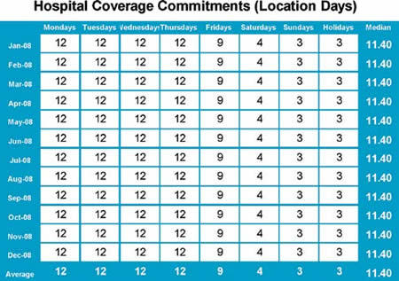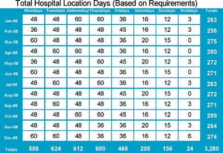 Applying this coverage map to our analysis requires multiplying each of the coverage tallies by the number of days associated with that day. In other words if there are four non-holiday Mondays in January then the total Monday coverage days equals 48 (12 * 4). Table 2 above provides a summary tally of the total location days the practice must cover in 2008, a leap year. While it is useful to know how to perform this calculation, the key to the analysis is to know the total (3,280 Hospital Location Days) for it is this number that ultimately drives all subsequent cost calculations and benchmark comparisons.