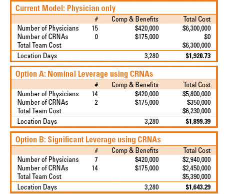 In the example in Table 5, a total annual cost per CRNA of $175,000 is used. This is actually somewhat below market, and is used here simply to highlight the argument and beliefs of hospital administrators, that it is the cost of the physicians that is creating the need for the subsidy. Two points of comparison are provided according to an assessment of reasonably equivalent staffing ratios based on a determination of FTE providers per 10,000 units billed. Option A simply highlights the financial impact of a nominal change in staffing model, while option B demonstrates the potential impact of a wholesale shift in the model. The savings of such a restructuring are significant. Of course, such an analysis fails to address the implications of actually executing such a transformation, not to mention the challenge of hiring so many new providers.