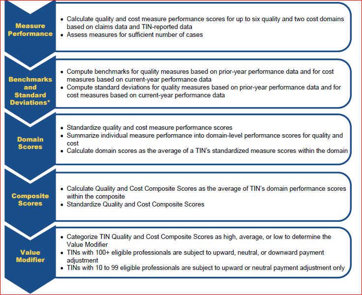 CMS will calculate the VM for each practice. It is derived from a quality composite score and a cost composite score. The quality composite score summarizes the group’s (determined by Tax Identification Number or TIN) performance on quality care for Medicare beneficiaries for as many as six equally weighted quality domains: (1) Clinical Process/Effectiveness, (2) Patient and Family Engagement, (3) Population/Public Health, (4) Patient Safety, (5) Care Coordination, and (6) Efficient Use of Healthcare Resources. Each domain score is based on performance scores for PQRS measures reported, using its associated domain. The cost composite score summarizes a TIN’s performance regarding resource use for its attributed Medicare beneficiaries, across two equally weighted cost domains: Per Capita Costs for All Attributed Beneficiaries and Per Capita Costs for Beneficiaries with Specific Conditions (diabetes, CAD, COPD, and heart failure).