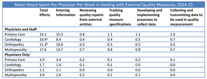 In a study published in the March 2016 issue of Health Affairs, US Physician Practices Spend More Than $15.4 Billion Annually To Report Quality Measures, Casalino et al. published the results of a survey of physicians representing four common specialties: internal medicine, family medicine, orthopedics and multispecialty practice. They found that:
