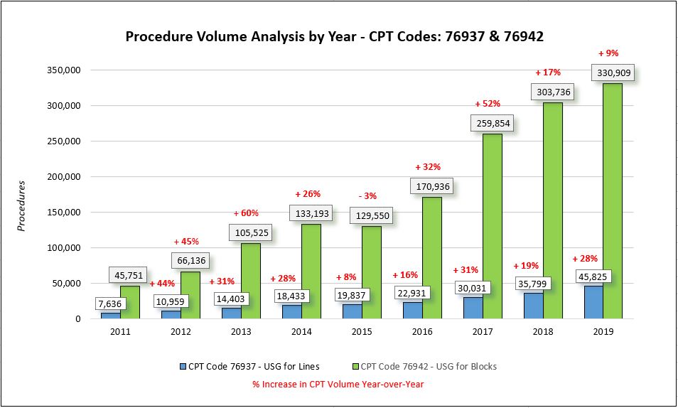 The use of ultrasound as a modality for both lines and blocks has dramatically increased over the past ten years, due to the service becoming the standard of care for most anesthesia practices (see table below). Interestingly, this has been driven by the anesthesia groups themselves, and not by hospital bylaws. Most new anesthesiologists coming out of residency programs have been thoroughly trained in the use of ultrasound techniques, while some of the more seasoned physicians who were trained using anatomical markers have undergone additional certification to refine their skillset.