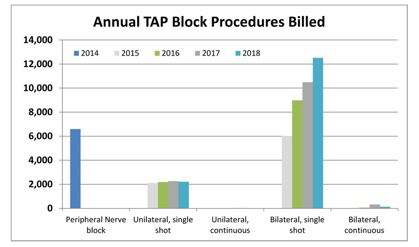 While these blocks are quite popular in some practices for a number of commonly performed abdominal procedures such as colectomy, total abdominal hysterectomy, inguinal hernia, caesarian section, laparoscopic cholecystectomy, and gastric bypass, not all anesthesiologists see the value of these blocks and usage is very inconsistent from client to client. To wit, we have had some interesting discussions of the clinical potential of their use. Billing data from the ABC client base indicates that there was a significant increase in the number of TAP blocks billed once the new codes were established and understood. 2015 billings were up 24 percent and 2016 billings were up 38 percent. Since then the rate of increase has declined to 165 in 2017 and 14 percent in 2018.