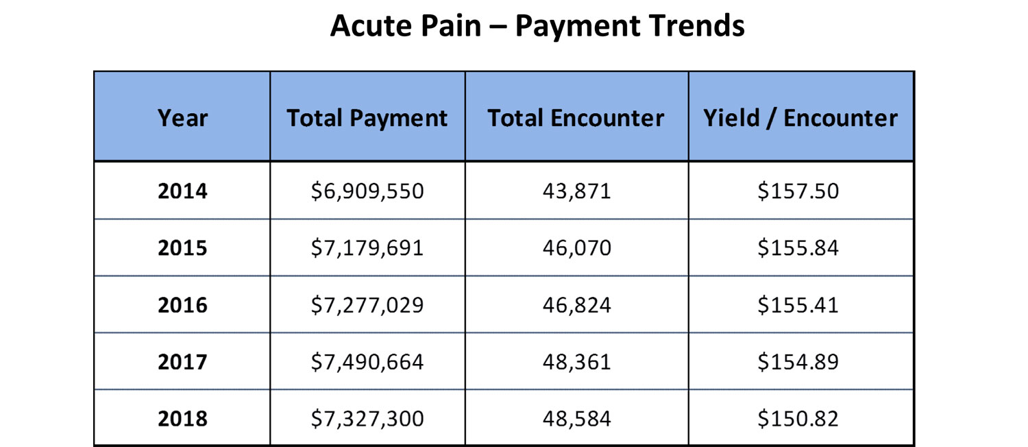 With the development of new clinical techniques or a change in existing protocols, there will typically be a market response. For example, as the use of epidural steroid injections by chronic pain specialists increased in the last decade, payer rates started to drop. One could connect the creation of new codes for endoscopy with their lower base values as yet another example of this same market-driven dynamic. How, then, do we explain the fact that payer rates for acute pain services, as listed in the below chart, have remained relatively stable? Obviously, payers still recognize the clinical relevance and value of these services because the erosion in reimbursement has been quite limited.