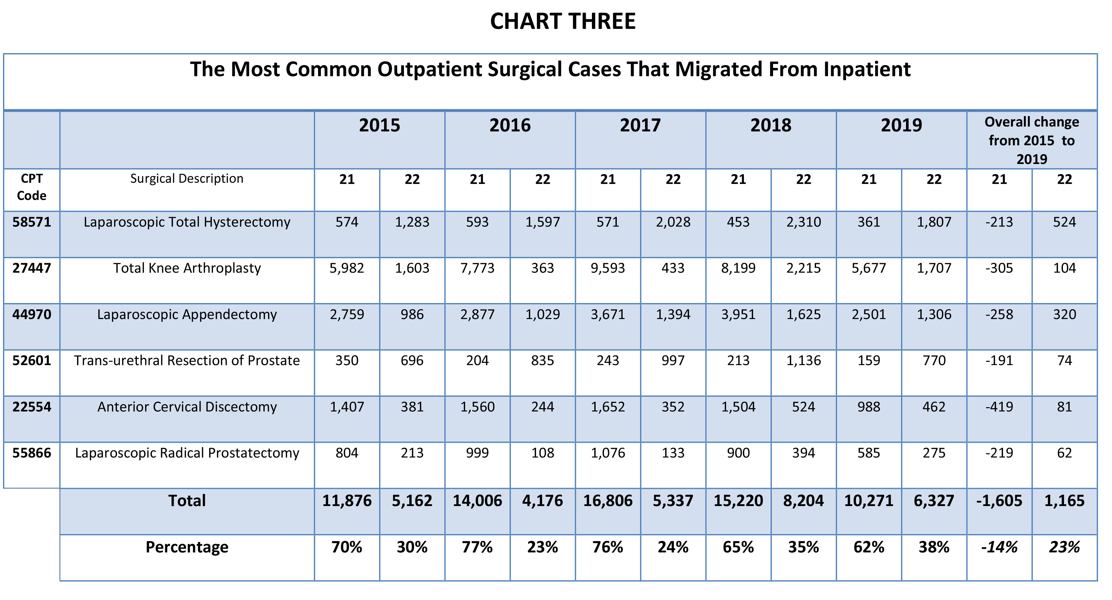 All of this raises a question about what kinds of cases are migrating to the outpatient environment. Using our sample of clients referenced above, we have identified the top six surgical procedures that have migrated over the last five years, as indicated in Chart Three below. Keep in mind that the inpatient setting is indicated by place of service (POS) 21, while POS 22 indicates cases in the hospital outpatient setting.