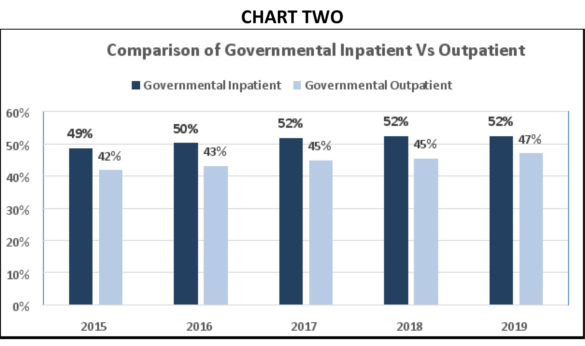 So, what are the realities that complicate this conventional view of the distinction between inpatient and outpatient venues? Let’s pull the lens back and put this discussion in perspective. We have pulled data for a period of five years so we could evaluate the impact of overall practice growth and the evolution of cases from the inpatient setting to outpatient venues in the Chart One above (Sample Volume Trends). This sample represents case volumes for 16 large practices in 7 states. All practices have at least one main hospital facility and a variety of ASCs. The first point to note is that all of the practices saw significant growth through 2018, and then things slowed somewhat. You will note that the outpatient case volumes were higher than the inpatient volumes and have tended to grow somewhat faster. Ultimately, though, the percentage of outpatient cases did not change dramatically.