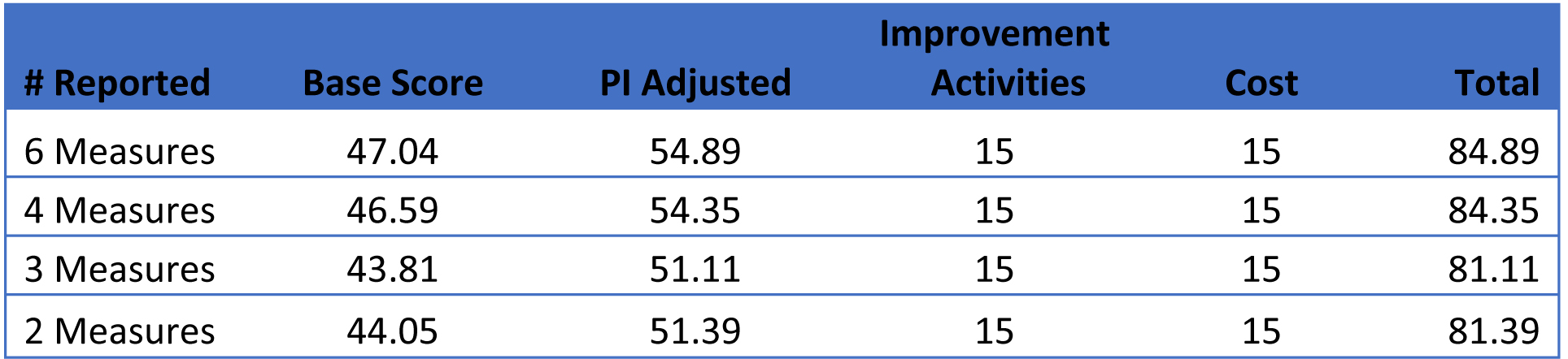 The first column lists the number of measures reported which, when calculated with the historical benchmarks and the ABC data, would yield the Base Score in column two. The Promoting Interoperability performance category excludes anesthesia reporting and its MIPS points are assigned to the Quality category yielding the adjusted total in column three. The Improvement Activities and Cost categories are assumed to be fully reported, yielding the Total value in the last column.