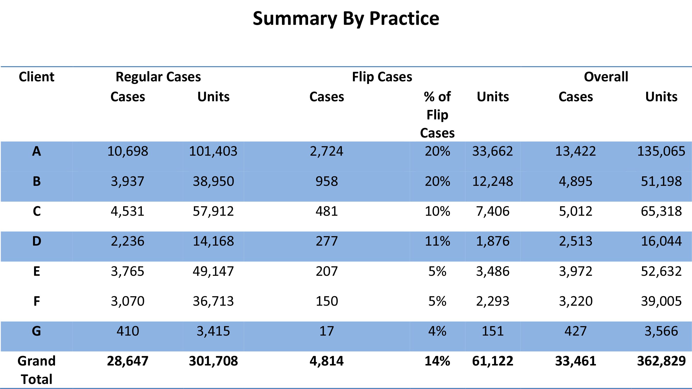 We reviewed data for six ABC clients across the country based on cases performed in September and October 2019. As indicated below, the percentage of flip room days varied significantly from one practice to another. The average for this sample was 14 percent. The medically directed practices are highlighted in blue.