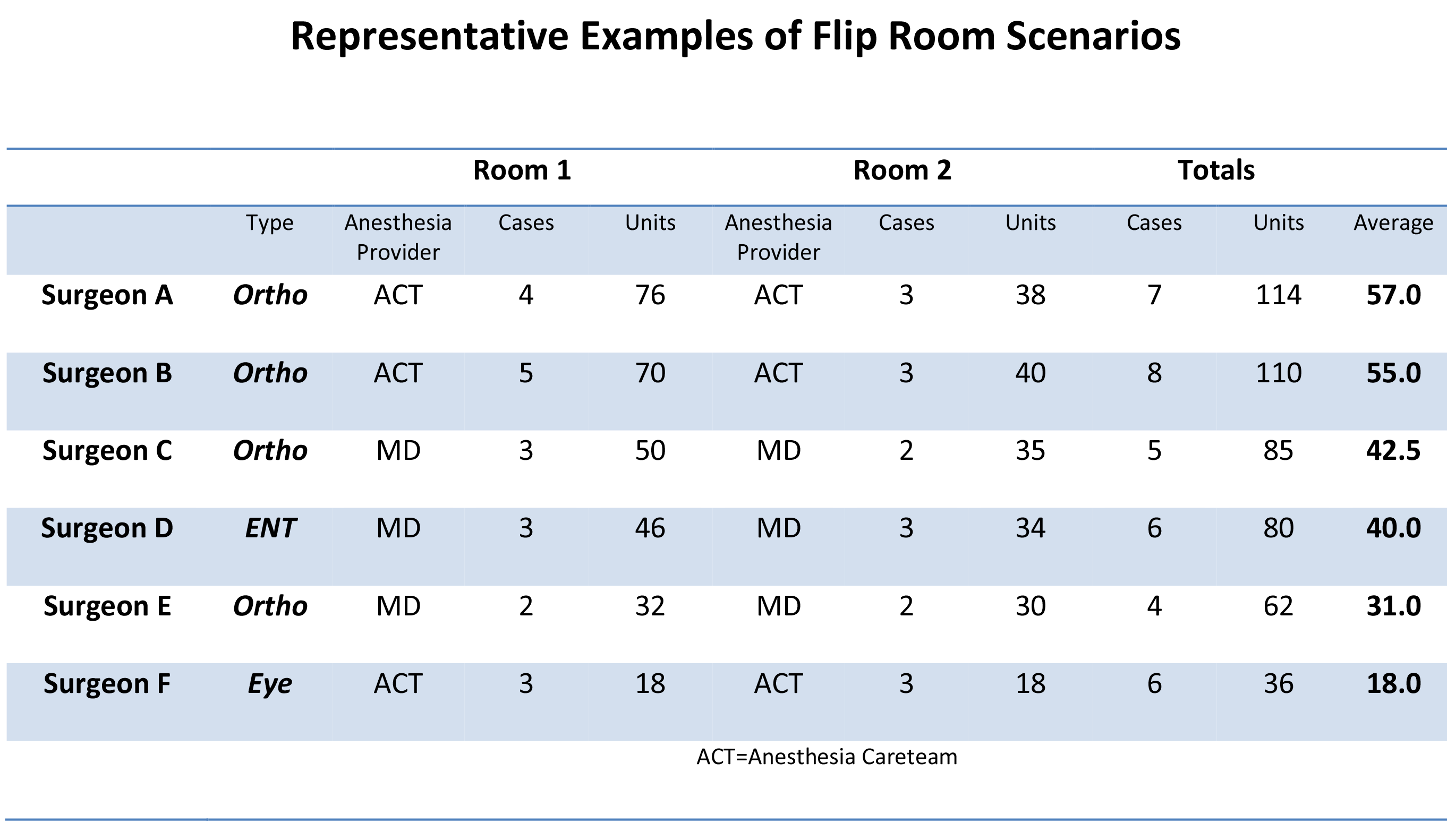 For purposes of the table above, we identified a typical line-up of cases for one of the busiest surgeons connected to each of the sample practices. The examples given do not represent statistical averages. They are intended to represent typical scenarios. While the anesthesia department may not have much input with regard to which surgeons get flip room coverage and which do not, it is still relevant and useful to know how the coverage requirements of each surgeon may impact staffing considerations. While not all anesthesia practices are care team practices, the data does seem to indicate that they are better positioned to deal with the impact of flip rooms—especially when considering that the second room is invariably a less productive room.