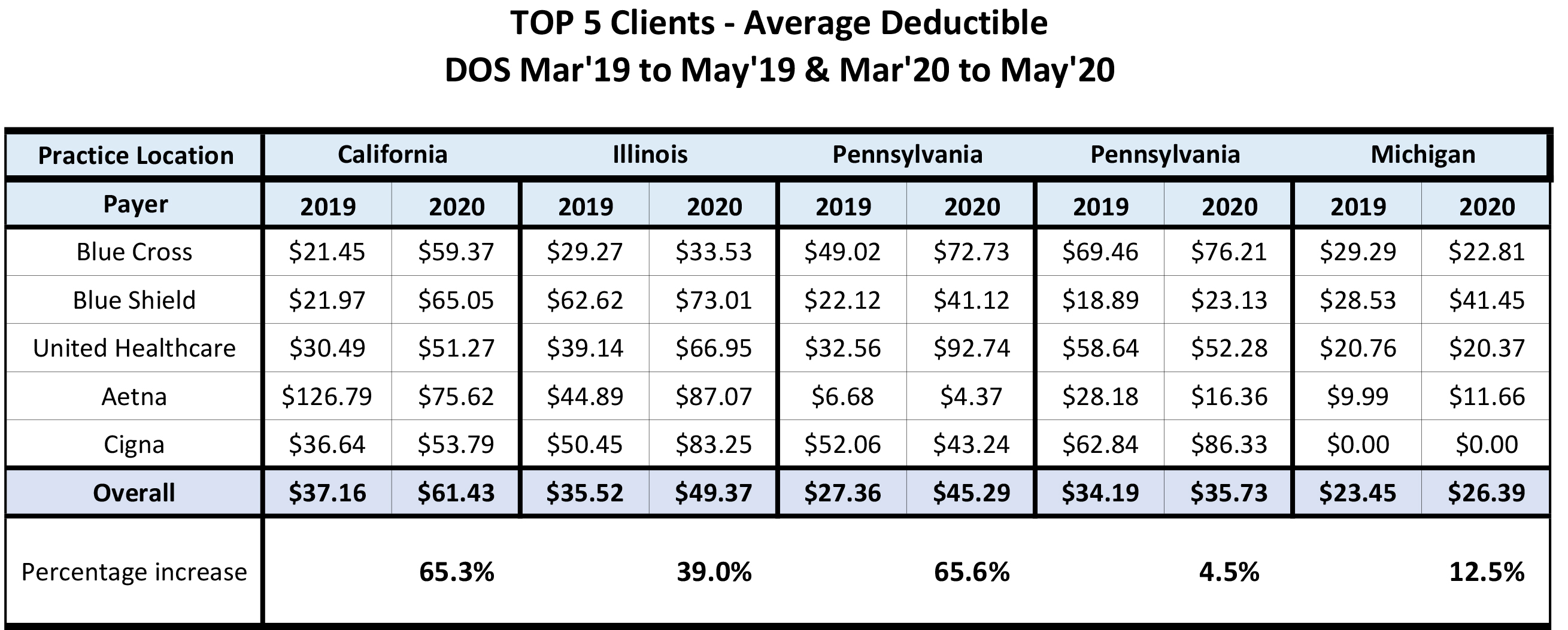 The table below is a representative sample of the increase in patient deductibles for five clients from across the country. For each of the plans listed, we divided the total deductible due by the number of cases billed to each plan. We only looked at the top five plans to simplify the example, but a comprehensive analysis might be useful for some practices. Obviously, many patients had satisfied their deductible by March but even so this had a material impact on collections, especially given all the other factors from March on.