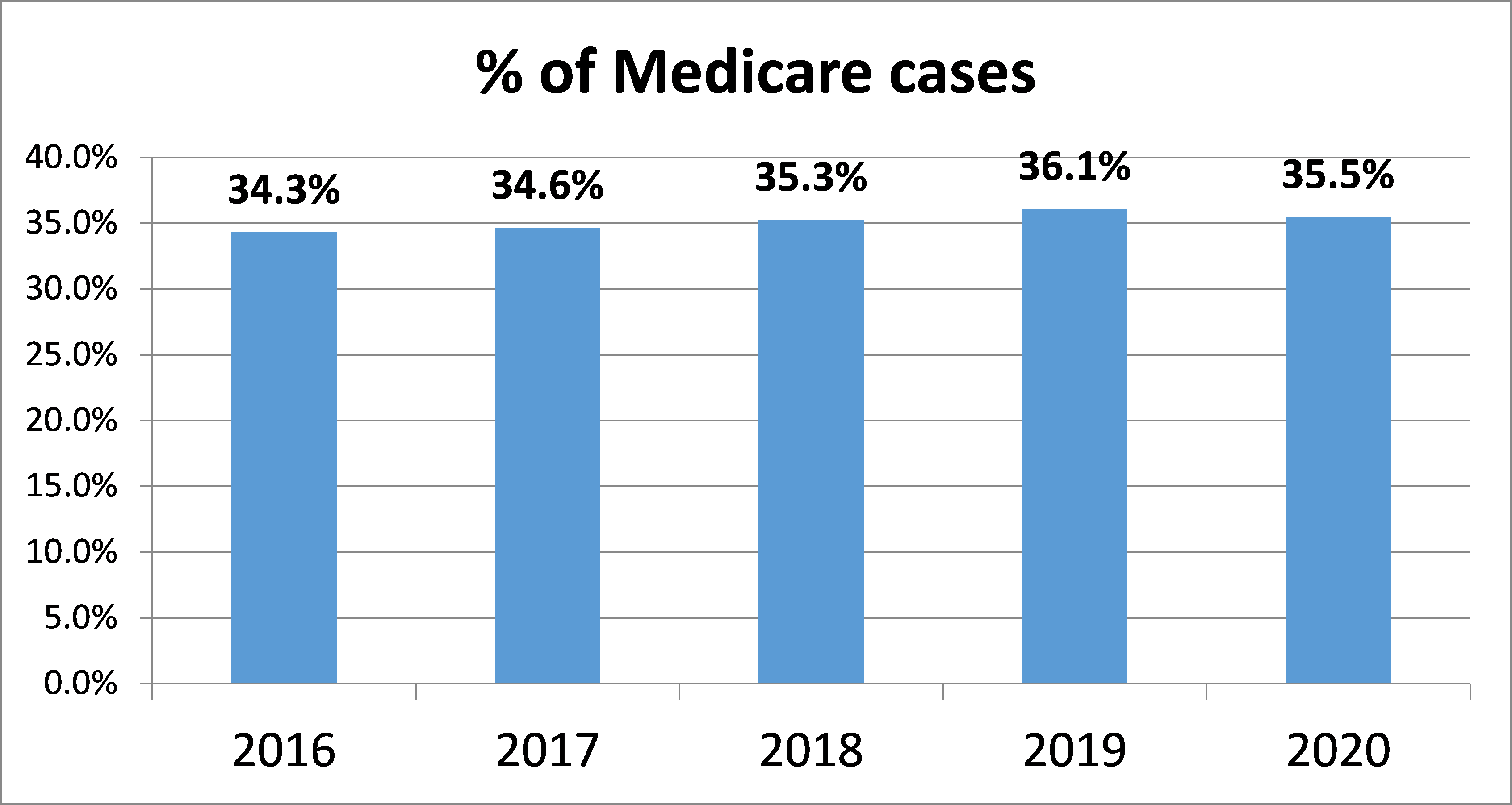 A review of a large sampling of our clients, for which we have five years of data, reveals just how consistent this trend is. While it is true that most practices have seen year-over-year increases in case volume through 2019, Medicare case volume has increased at a faster rate. 2020 was an exception because of the impact of Covid-19. Not only did case volumes drop, but Medicare patients were especially concerned about the possibility of getting infected if they had surgery.
