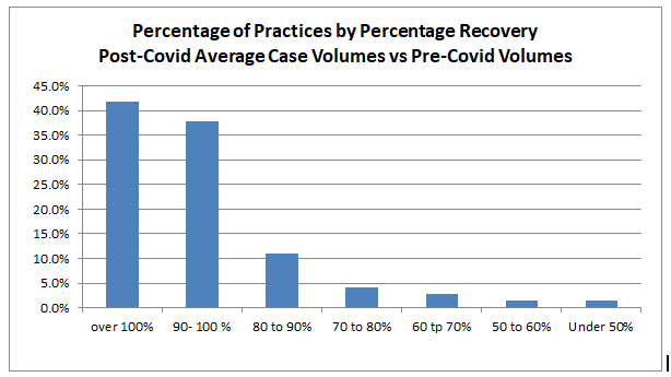 This chart represents the average production levels for a large sample of our client practices. As one would expect, there are many outliers in both directions, some much slower to recover and some much faster. As the table below demonstrates, 80 percent of these clients saw at least a 90 percent post-Covid recovery. In addition, 42 percent actually saw post-Covid volumes that exceeded pre-Covid average monthly volumes. Many factors have distinguished the practices that recovered fastest from those that are still lagging behind. Location and demographics are key. Practices with strong volume trends prior to Covid tended to bounce back fastest.