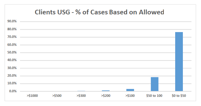 The three charts below reflect the current reality of flat fee billing. Taking the three codes listed above, we have done an analysis of a large sample of our clients to see what percentage of services were paid at or around the Medicare allowable. While some practices may have a few plans that still pay for these services based on the historical ASA base values, these are very much the exceptions. It should be noted that, for this analysis, we only considered the payer allowable amount. We did not consider the impact of patient responsibility.
