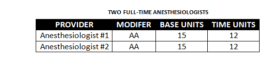 Cases that call for two simultaneous anesthesia providers often involve massive traumas or high-acuity heart surgeries. Let’s say the patient has a three-hour procedure involving an abdominal aortic aneurism (AAA), with a base unit value of 15. One anesthesiologist may be needed to monitor while his/her partner administers medications and tends to other vital tasks. Let’s further assume that both were present for the entire case. In this situation, both providers are essentially personally performing in a concurrent manner. Here is how the case would break down from a claims perspective: