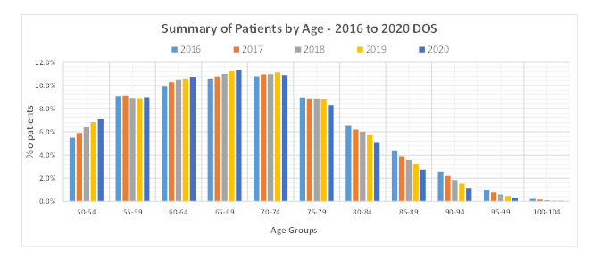 To assess the impact of demographic trends on our clients, we conducted a review of 20 large groups from all across the country based on changing age and gender patterns over a period of five years, from 2016 to 2020. Curiously, the percentage of patients over 65 actually decreased from 2016 to 2020, from 45 percent of the total patient population to 40 percent. This may or may not be good news, depending on one’s perspective.