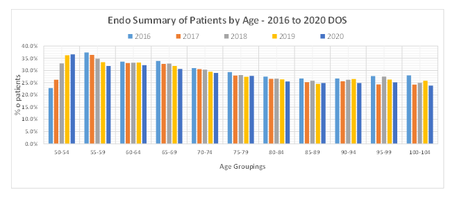 Of particular interest to anesthesia providers is the mix of services provided. While the dramatic growth in the provision of anesthesia to patients undergoing endoscopic procedures preceded 2016, it may come as a surprise to some to learn that endoscopic anesthesia has consistently represented about 25 percent of all services provided. As the chart below indicates, there was a dramatic increase in patients under 60 getting colonoscopies from 2016 to 2020. Many practices saw a drop in Medicare patients getting colonoscopies in 2020, which is indicated here. Because these were elective procedures, most observers believe this volume will return to normal in 2021.