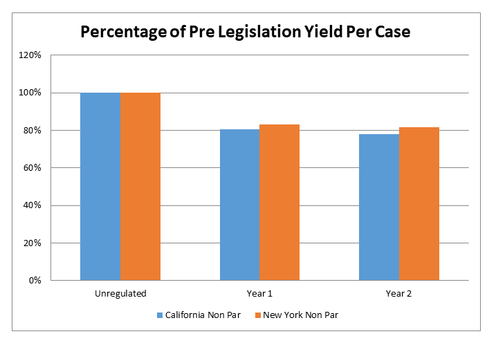 Narrowing our focus to clients in those two states yields some interesting results, though at an anecdotal-volume level. Reviewing the impact on reimbursement of OON claims filed in the first two years of active legislation shows a similar trend in both states. Unsurprisingly, yield per case dropped approximately 20 percent versus pre-legislation rates. The actual decrease, however, was of a more reasonable proportion than the feared race to the bottom at Medicare rates.