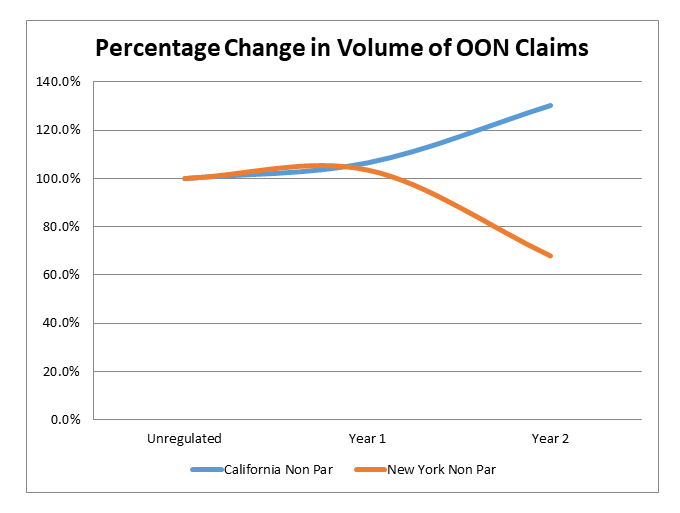 Of interest also is the regulation’s impact on the volume of out-of-network claims. New York saw a reduction in OON volume, while California conversely saw an increase in the volume of non-participating claims. Taking into consideration that both models resulted in similar reimbursement impact, one possible interpretation is that anesthesia groups in New York were able to successfully negotiate with insurance plans in that state under the new reimbursement environment. In California, insurers leveraged their advantage to make participating rates untenable or even terminate existing agreements. Despite the intent to encourage participation, one unintended consequence may be that this legislation inhibits negotiation of reasonable contract rates by anesthesia practices.