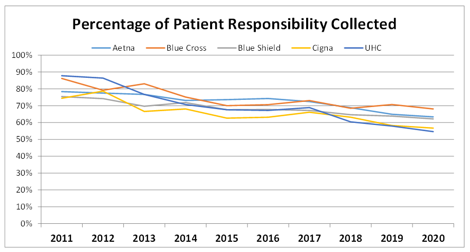 Unfortunately, this is not the end of the story. Commercial insurance plans always involve a deductible and a co-payment, usually 20 percent of the allowable. Although patient willingness and ability to pay their share of medical bills has been declining, the impact of the COVID-19 pandemic was particularly significant. What this means is that minimal rate increases are actually offset by declining collections.