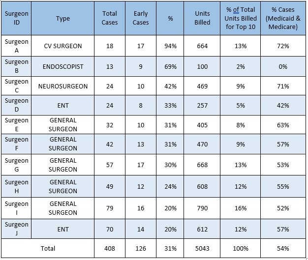 It should be noted that CV and neurosurgeons usually start their cases early because their cases are generally long cases, especially in a facility with a limited cardiovascular case load. It also appears that endoscopy is not a significant line of business in this facility. Although the endoscopist performed 13 cases during this period, they were mostly early cases. Of particular interest was the impact of public payers, Medicare and Medicaid. For this facility, it clearly does appear that a disproportionate percentage of patients are covered by public payers. The exception is the endoscopist who does not appear to treat Medicare patients.
