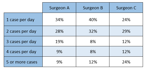 As a drill-down, we then examined the performance of the top three general surgeons at the facility. The question we really wanted to address was how much of the time they performed a single case and then went elsewhere. As the table below indicates, for all three surgeons, long line-ups of cases were the exception, rather than the rule. With one exception, surgeon C, only 20 percent of the days involved a line-up of four or more cases. It should be noted that this is consistent with an operating room utilization analysis that shows that, based on an eight-hour shift from 7 AM to 3 PM, the average room only generated about 3 hours of billable anesthesia time, which is well below the optimum productivity metrics. One can only conclude that, as is true in so many facilities, there is an inconsistency of operating room utilization.