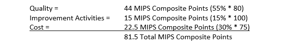 When added together, these three categories must total 75 points or more to avoid a penalty in 2023. For example, at the end of the year when each category score is calculated, and your results are 80 percent in Quality, 100 percent in Improvement Activities, and CMS awarded 75 percent in Cost, your total would be as follows: