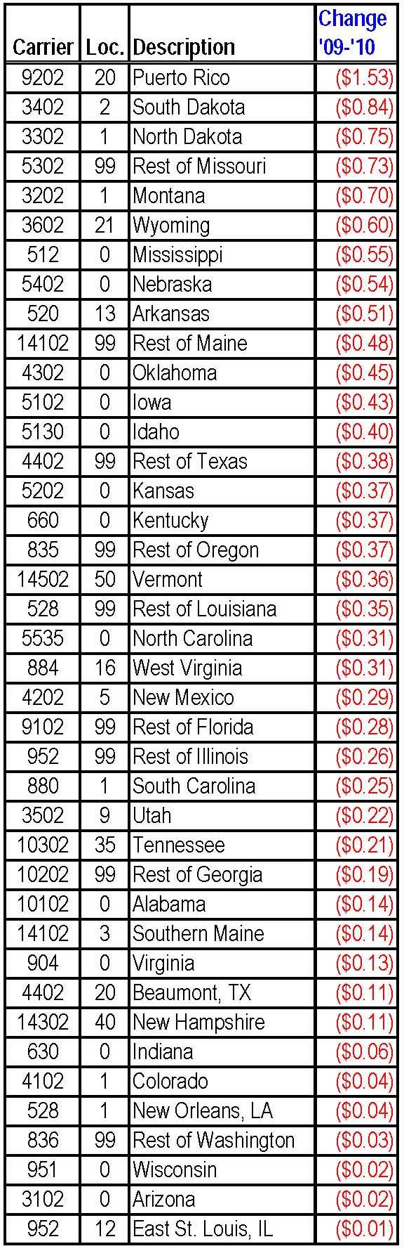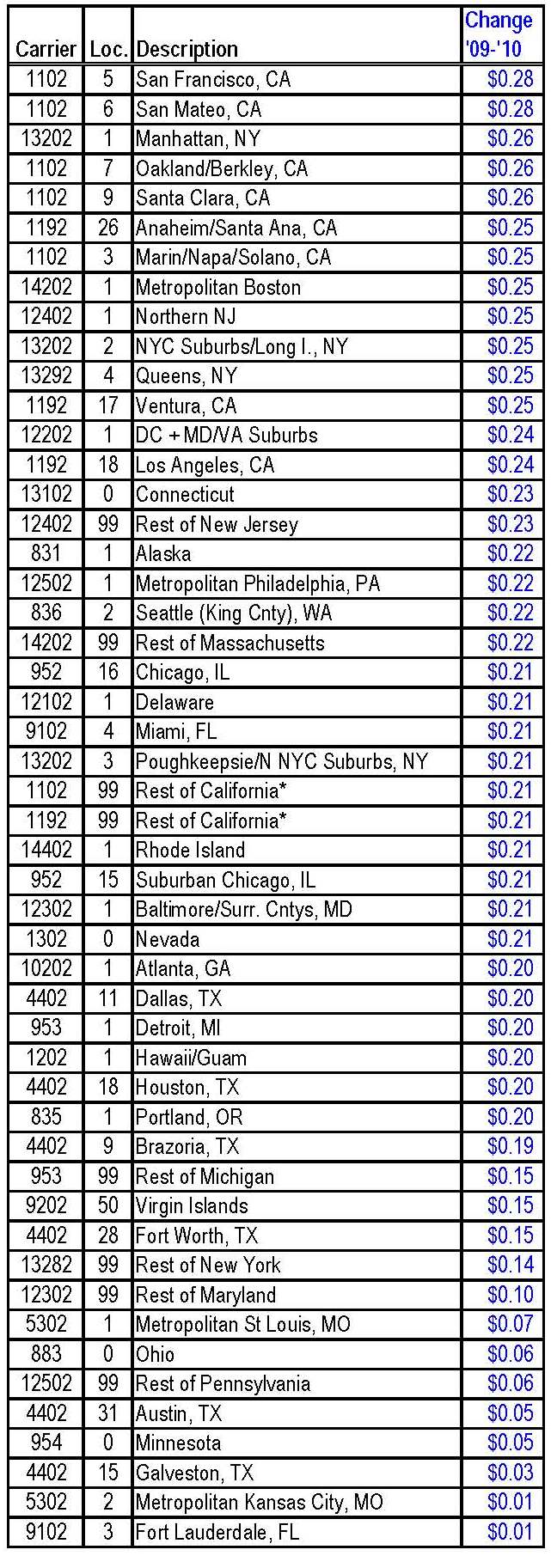 The first thing one notices is that the difference between 2009 and 2010 rates is not a uniform -21.2 percent. Some localities even have a positive update. This is because the geographic adjuster applicable to each locality varies considerably. On January 1, 2010, the statutory “floor” on the geographic practice cost indices (GPCIs) floor for “work” relative values was removed (except in Alaska).