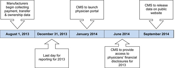 As of August 1st, certain manufacturers of drugs, medical devices and biologicals are tracking their payments to physicians, as required by the Physician Payments Sunshine Act (Sunshine Act), which is part of the Affordable Care Act. They will report payments and other items of value worth more than $10, as well as certain ownership interests held by physicians and immediate family members, to CMS annually. Reporting may begin immediately, on a voluntary basis, and must begin by next January. CMS will post the information, by physician, on a public, searchable website.