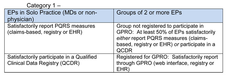 For the great majority of anesthesia practices, the VM matters for one principal reason, that it will apply an additional payment cut to EPs who do not satisfactorily participate in the Physician Quality Reporting System (PQRS). This cut would be four percent for groups of ten or more EPs and two percent for groups with two to nine EPs and solo practitioners. Thus failure to report under the PQRS in 2015 could cost an EP (in a practice with ten or more EPs) a total of six percent of every Medicare payment in 2017. Approximately 60 percent of anesthesiologists successfully reported their PQRS measures in 2012, the most recent year for which we have data. The proposed cumulative six-percent and four-percent negative adjustments should be sufficient reason for every anesthesia professional to meet at least the minimum PQRS requirements next year.
