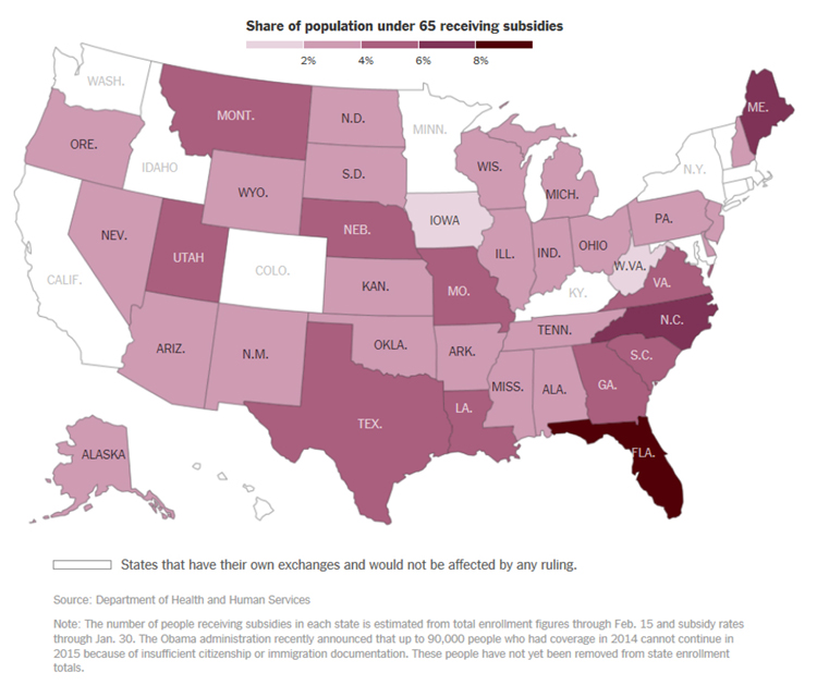 The interest in King v. Burwell is not surprising. If the Court decides in favor of the plaintiffs, between 7.5 and 8.2 million persons in 34 states that have not created their own health insurance exchanges stand to lose the coverage that they have been able to obtain because of the ACA subsidies. Eighty-seven percent of individuals who have signed up in the 34 states are eligible for subsidies, which average about $268 per month. Premiums are expected to increase by about 35-57 percent for those who remain in the federally run exchanges if and when many of the formerly subsidized drop out.