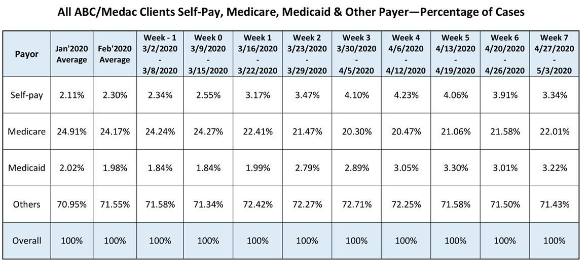 May 26, 2020 Each week, we are all updated on the growing ranks of the nation's unemployed. State lockdowns have resulted in some unimaginable unemployment numbers in every state. As of May 21, another 2.4 million workers were added to the jobless rolls, bringing the total to 38.6 million—and this number represents just the individuals who were actually able to file. Some states have reported such a volume of unemployment claims that many people were not even able to complete the process. As traumatic as it is to lose a job, typically this involves loss of insurance as well. COBRA may be an option for some, but it is usually prohibitively expensive, and so an ever-increasing number of Americans are simply going without. Tracking Percentage of Uninsured Patients One of the metrics most practices track is their percentage of self-pay or uninsured patients. While the percentages can vary considerably from one practice to another based on location and type of practice, the overall ABC/Medac client average for the first 10 weeks of the year (January 1 through March 15, the onset of the coronavirus lockdown) was 2 percent. As the table below indicates, the percentage of Medicaid and uninsured patients increased through week four. As the table also indicates, this increase corresponded to a drop in the Medicare percentage by week. As one might have anticipated, a significant percentage of seniors decided not to have their surgical procedures because of their risk status for COVID-19.
