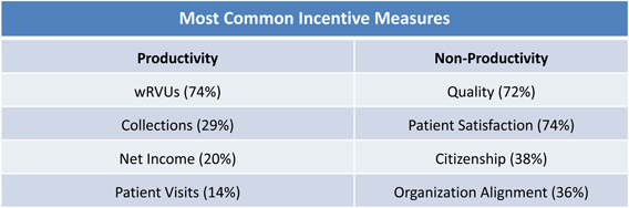 According to Sullivan, Cotter & Associates, Inc., 2011 Physician Compensation and Productivity Survey 86% of physician employers use incentive based pay system with 80% of the salary coming from some type of base formula and the remaining 20% comes from incentive payments. Incentives may be based on a wide range of factors and often incorporate multiple incentives. For example, 72% incorporate some incentive for quality into the compensation formula whereas only 38% consider a citizenship factor. The following chart, from the same Sullivan, Cotter report shows the most common factors used to incentivize physicians: