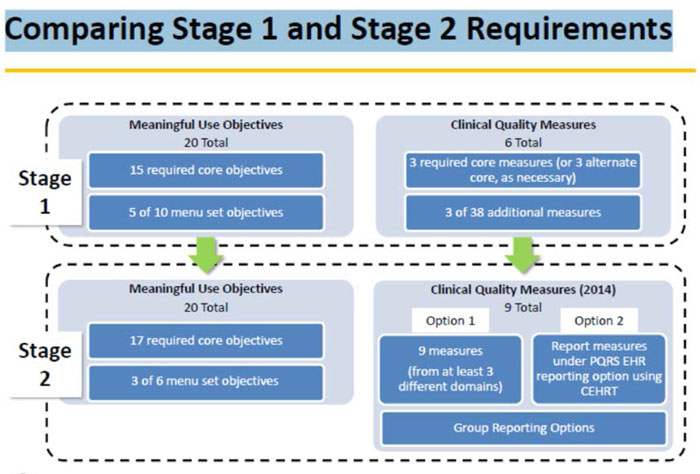 The difference between the Stages lies in the number of “Meaningful Use Objectives”; and “Clinical Quality Measures” that must be reported. The chart below shows the requirements for Stage 1 and Stage 2 (which, like everything else concerning the MU program, are highly complicated):