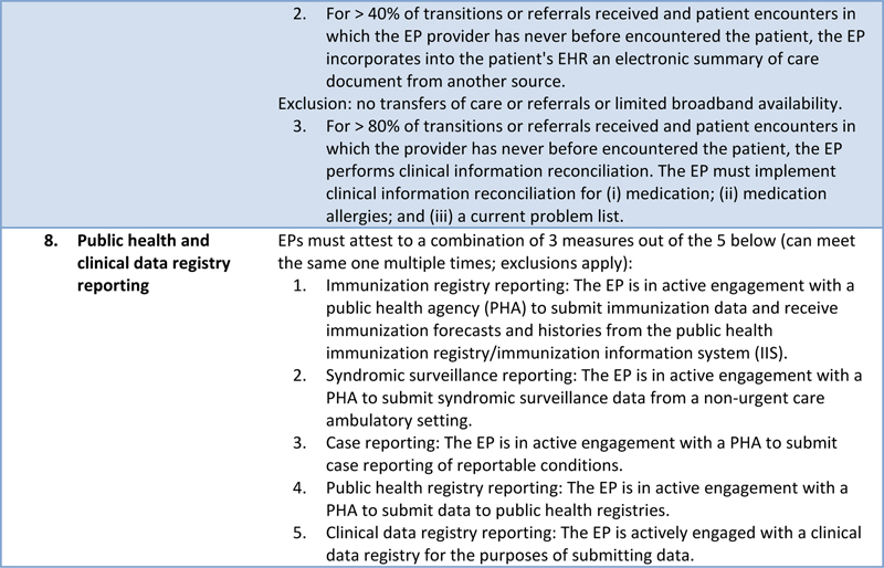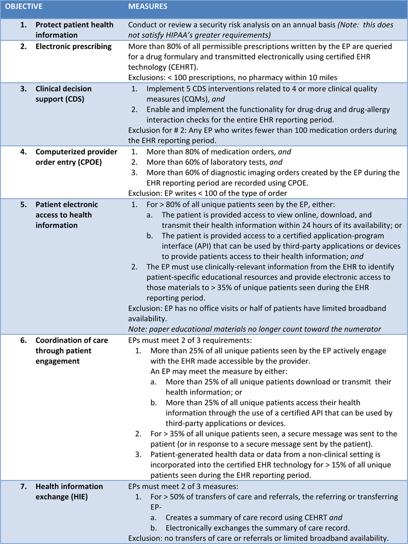 - replace all existing objectives and measures and reduce the overall number of objectives to the following eight, which would apply to EPs and hospitals alike, regardless of the stage they were at in the prior reporting period. The Stage 3 objectives, and their associated measures are as follows: