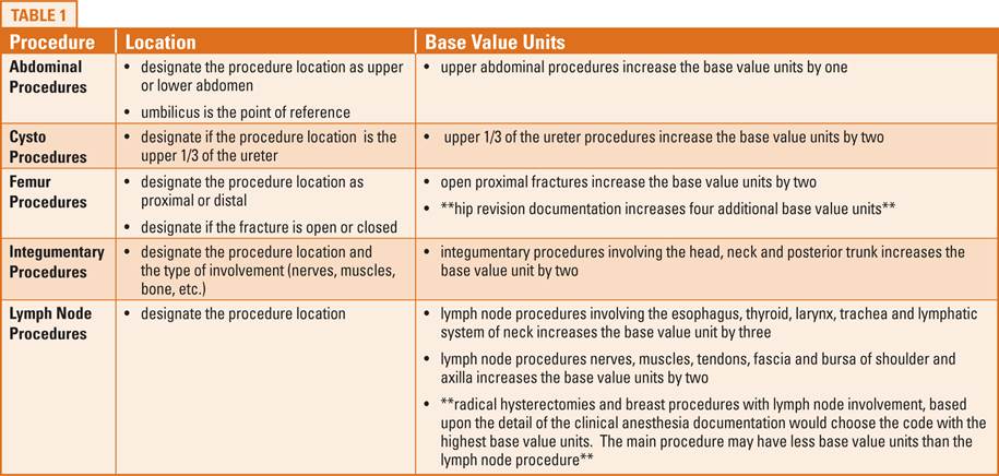 Shown in Table 1 are examples of some common elements of clinical anesthesia documentation that are necessary for accurate coding and optimal reimbursement.