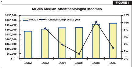 It should not surprise any reasonable observer of the anesthesia marketplace that a sharp spike in income and income expectations will trigger a reaction. Since anesthesiology groups are using the MGMA survey data as the basis of their requests for more support, hospital CFOs are starting to question the numbers with ever more care. Inevitably the survey data is proving to be as much of an obstacle as an argument for anesthesia requests for subsidies. The reason is simple; the tide has turned. With an increase in the supply of qualified providers, hospitals are beginning to look more at their own bottom line than the possibility of losing their anesthesia groups. To some this shift is perceived as counter-intuitive. In an effort to control costs long-term, a growing number of hospital CEOs are revealing that they are willing to pay considerably more in the short term to change anesthesia groups even if it means relying on locums for a period of time. The message seems to be that hospitals are growing restive and considerably less willing to give in to requests for financial support that will continue to increase anesthesia provider compensation in the face of declining overall hospital profits. They must be on to something, because anesthesia practices seem to be backing down and accepting what they are being offered with increasing frequency. The evidence of this change in attitudes is both empirical and statistical. The most recent MGMA compensation survey shows only a nominal increase (3%) in median compensation from the previous year (see Figure 1).