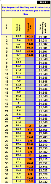 The data in Table 1 were developed to objectively assess the impact of staffing models and provider productivity on the overall cost of anesthesia care. The data are based on a sampling of ABC client data for 40 practices, carefully reviewed and compiled for this purpose. These are all private anesthesia practices, which have been with the company for at least year. They represent clients all across the country with consistent books of business, i.e. none is in a ramp-up mode for any of its main facilities. FTE staffing levels were based on a standard metric of days worked and assumed that an FTE physician or CRNA would take 6 weeks of vacation. The significant disparity in the cost per day of coverage for an anesthesthetizing location is the result of both productivity and coverage requirements, which will be discussed in more detail below.