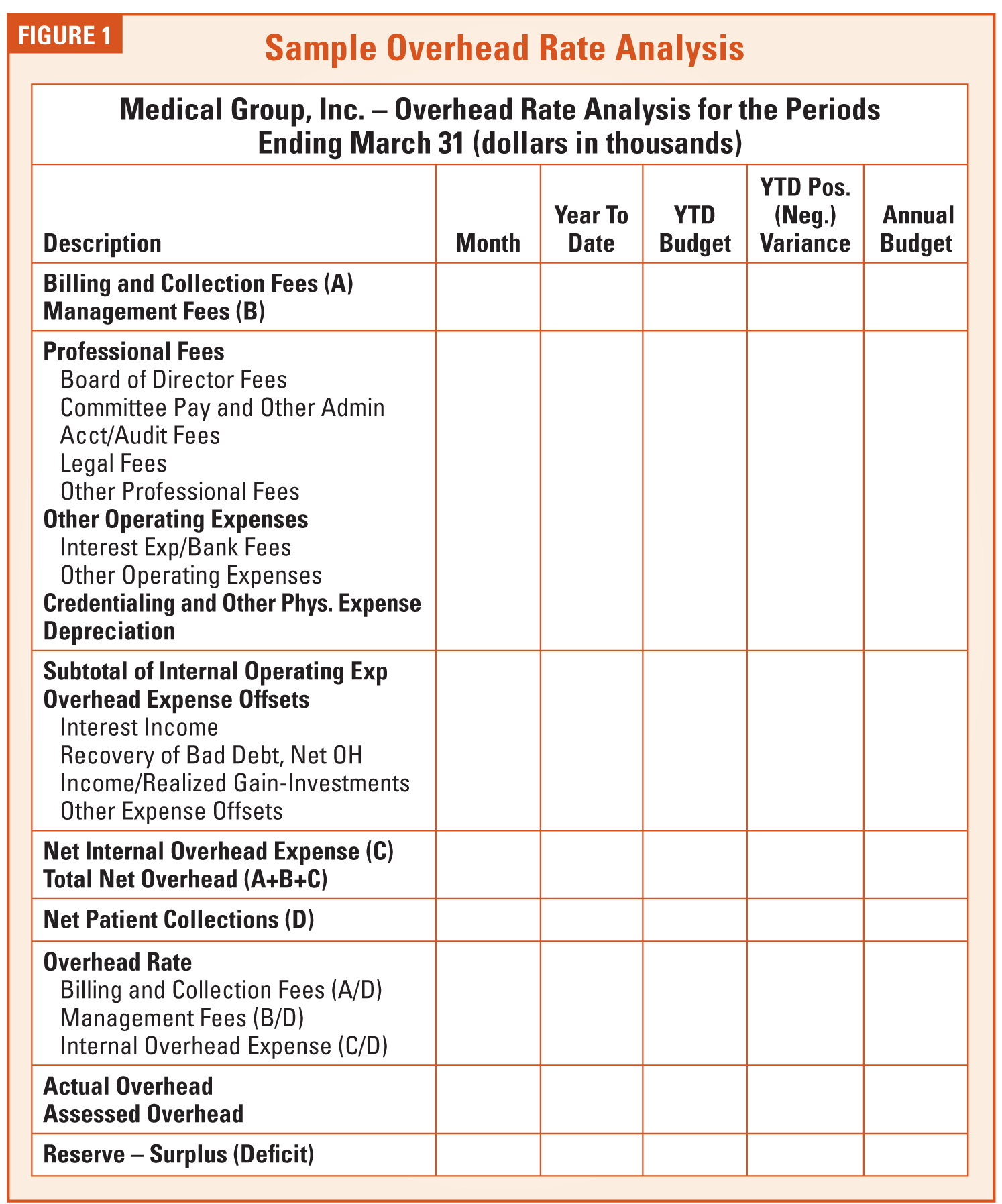 - Income Statement – Shows all major categories of revenue and expenses for the most recent month end, current year to date, year to date actual at the same time last year, current year budget year to date, and a column showing the variance between current year to date actual and budget. In order to fit this statement on one page, all expenses deducted from individual physician compensation are shown as one total, as are all overhead expenses. The subschedule for the former is a simple listing of the detail on one page with all of the same column headings. The subschedule for the overhead expenses is the Overhead Rate Analysis described in Figure 1 on page 15.