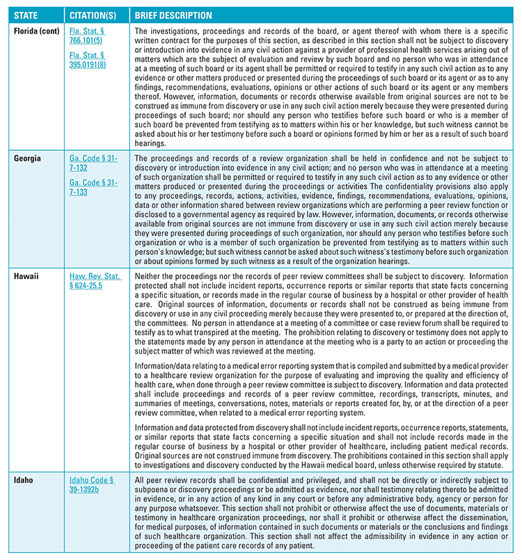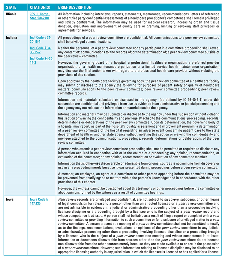 On the next 3 pages, you will find Part I (Alabama through Iowa) of a brief summary of what is protected by the peer review privilege in every state. Please note that the table is meant to be strictly informational and would require a more detailed review of the state’s judicial interpretation of its statutes. A summary of the remaining states (Kansas through Wyoming) will appear in the next issue of The Communiqué.