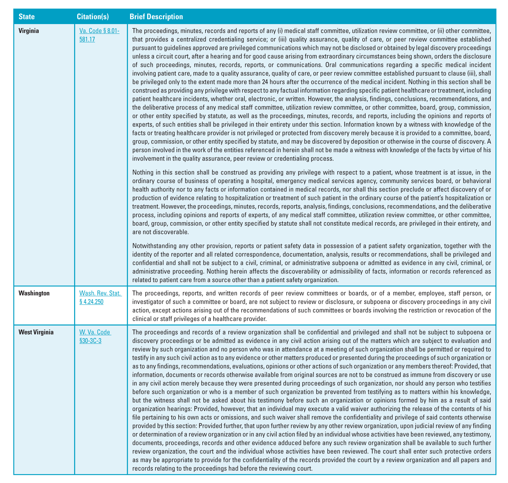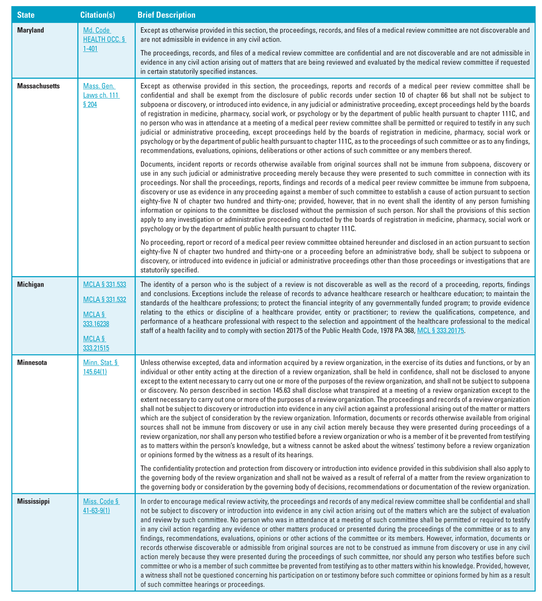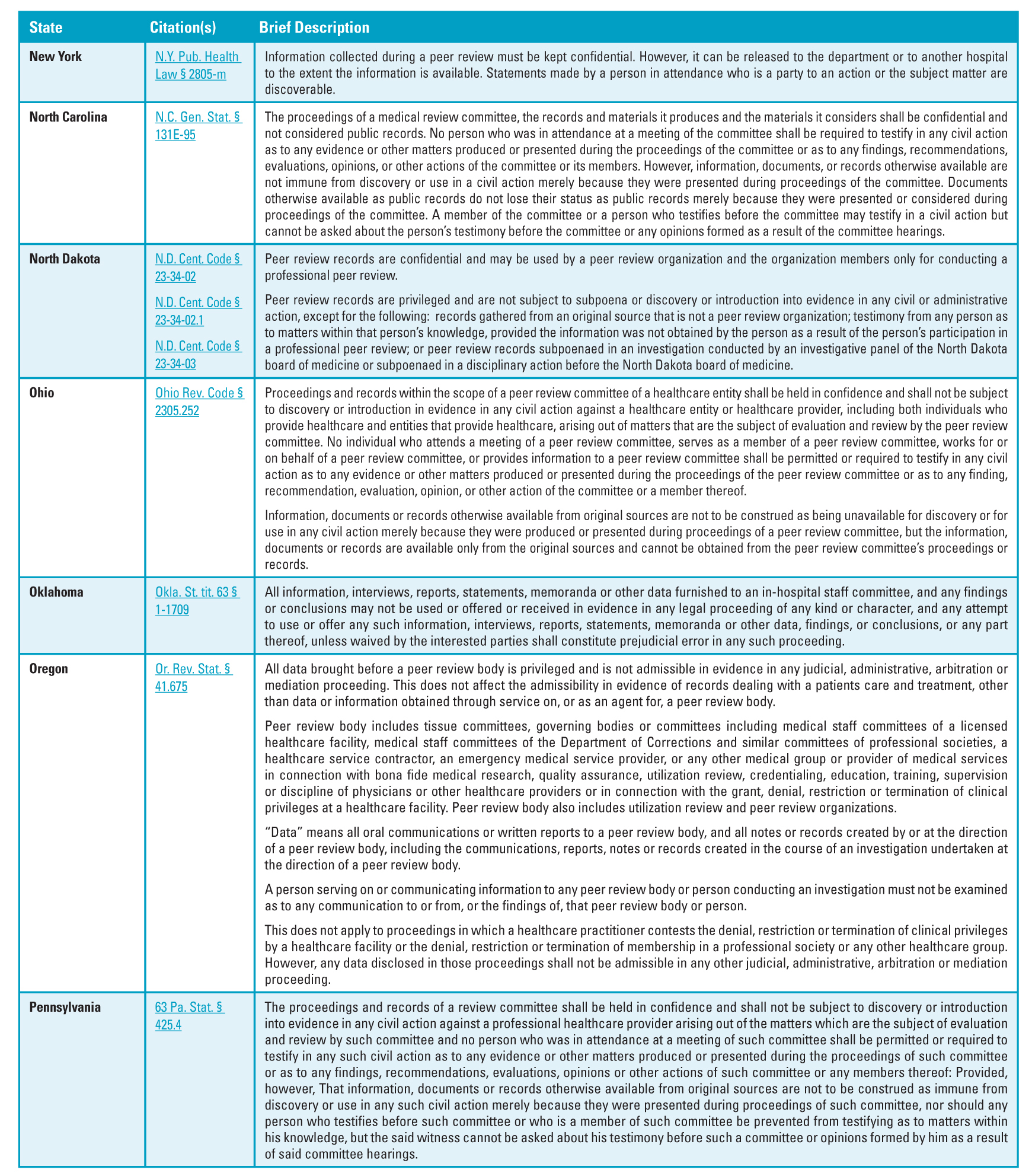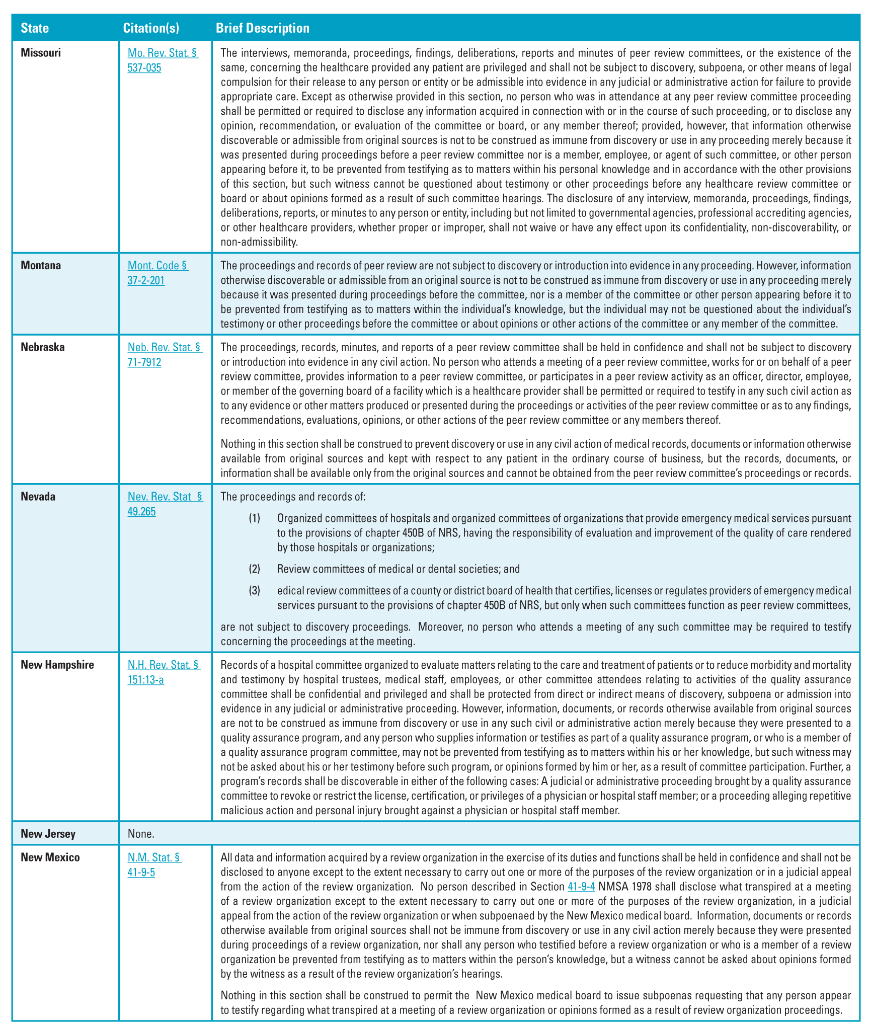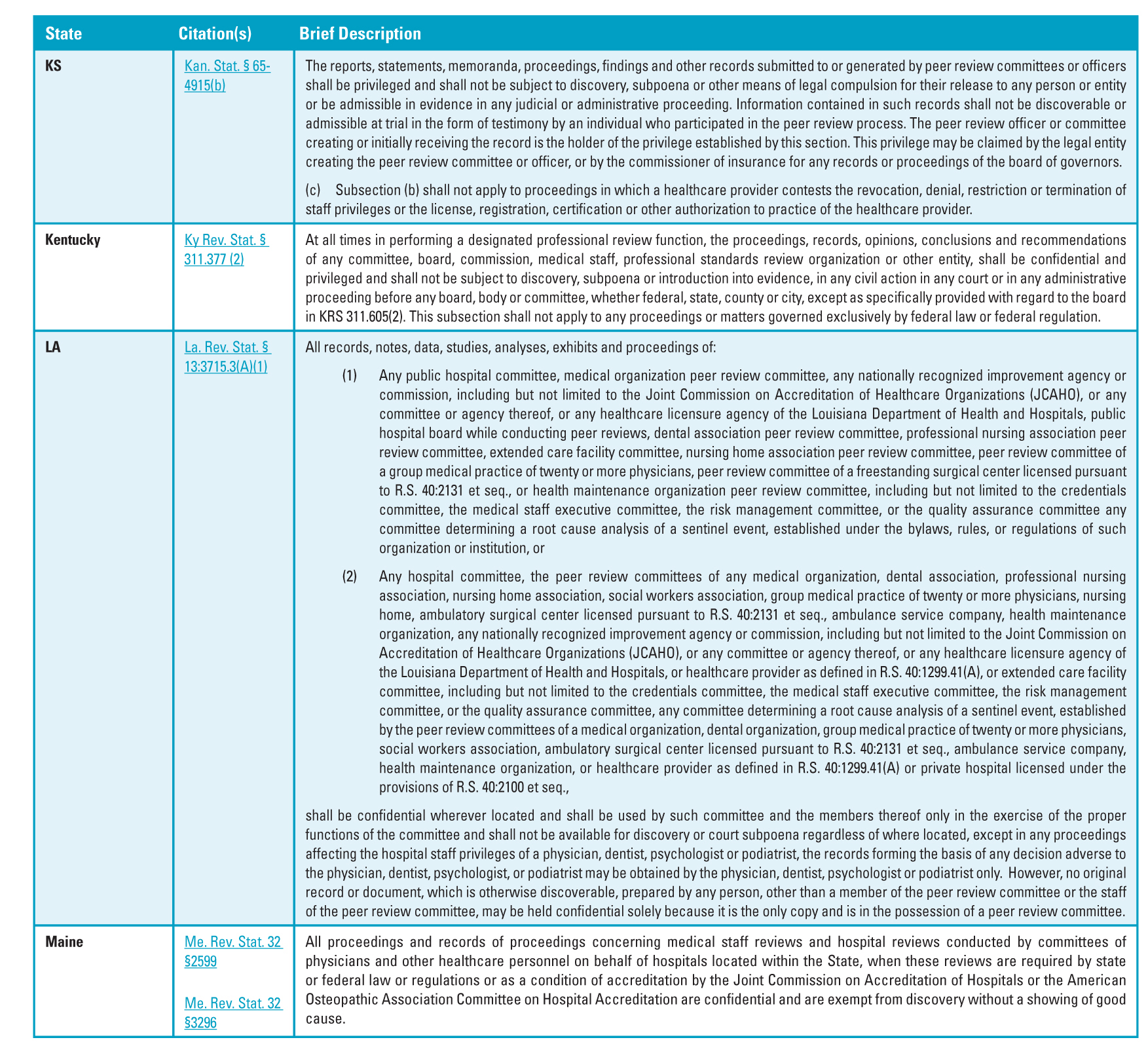 In the Winter 2016 issue of The Communique, we offered Part I of a summary of state laws (Alabama through Iowa) involving the peer review process. Here we are continuing that summary with the remaining states (Kansas through Wyoming).1