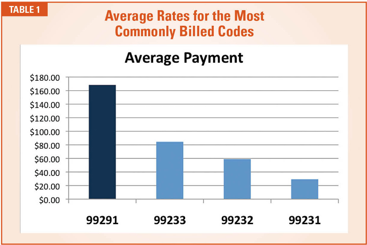 Quite different from anesthesia billing, ICU billing involves some unique compliance considerations. Conceptually, all patients must be triaged based on acuity of care. If a new patient introduced into the unit receives a full workup that takes an hour or more, the work would probably be billed with CPT Code 99291 (CPT Code 99291 – critical care, evaluation and management of the critically ill or critically injured patient; first 30-74 minutes), but specific criteria have to be met. If the acuity of care does not meet the CPT criteria, then the workup must be down-coded to a subsequent hospital visit, which is paid at a considerably lower rate. Table 1 indicates average rates for the most commonly billed codes. Obviously, the overall yield per workup will depend on the mix of patients and the conditions they present.