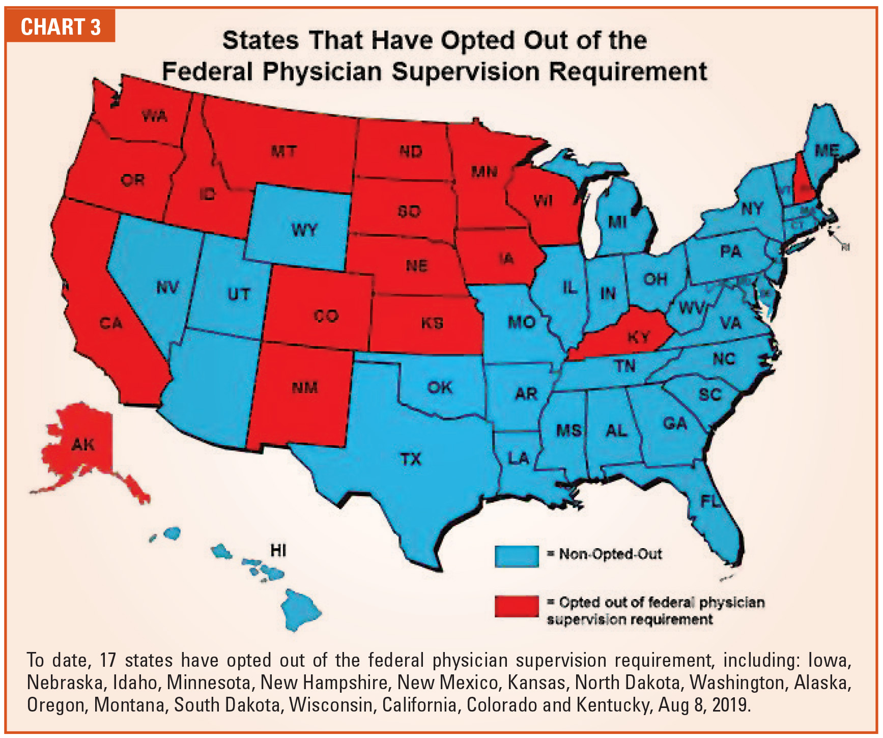 Chart 2 provides a breakdown of cases performed between January 2019 and June 30 by all Anesthesia Business Consultants’ (ABC) clients across the country for Medicare patients. The data was pulled based on the Medicare concurrency modifier used for billing. Based on this sample, 72 percent of all cases billed by ABC to Medicare involved care by a CRNA.