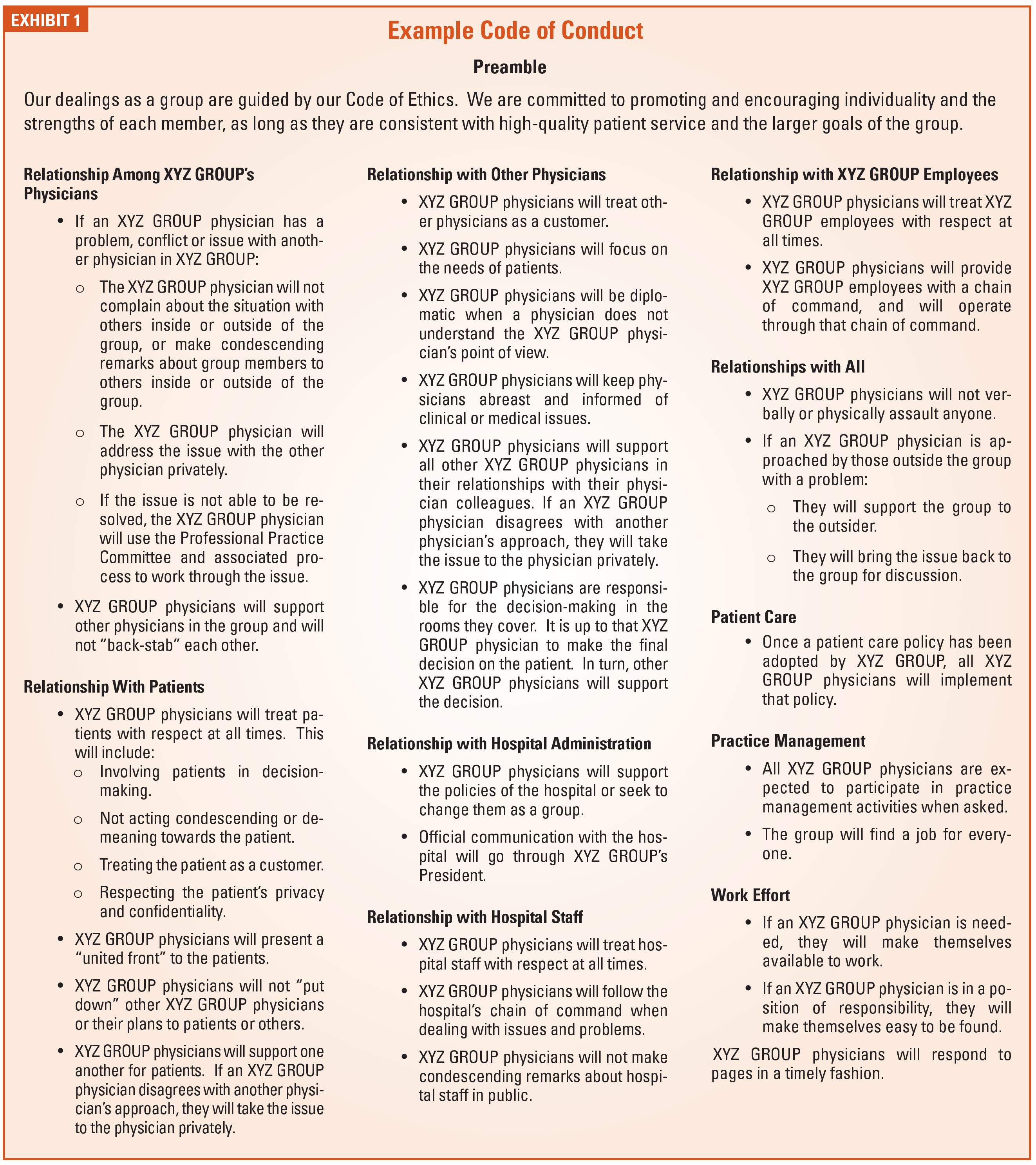 Properly developed, this document can be used to effectively reign in problematic physician behavior. Everyone has fair warning about what the agreed upon expectations are. Toleration for outliers is reduced. Group leadership can act because an intervention is no longer seen as one person’s opinion versus another’s.