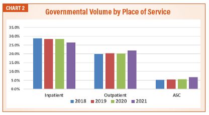 Drilling down to governmental payers helped illuminate how much of the shift is due to the change in regulation. An overall increase in procedures permitted in outpatient and ASC places of services for Medicare patients resulted in the expected shift in service locations. The volume of inpatient services decreased as 26.4 percent in 2021. This is particularly concerning for anesthesia, as the differential between commercial and governmental rates is more material than most specialties (See Chart 2).