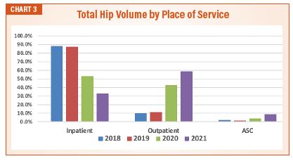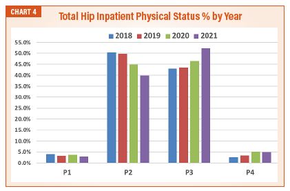 A review of the average ASA physical status classification for 2021 total hip replacement patients from our practices suggests that physicians guide patients to the place of service that is consistent with their risk profile. The lowest average ASA physical status value was for patients with services in ASCs. The patients with highest average ASA classifications were served in an inpatient setting, due to the potential need for complex anesthesia or increased clinical backup. With the expansion of potential venues, the graph (See Chart 4) shows the reduction of less-risky (lower ASA physical status rated) patients from the inpatient place of service.