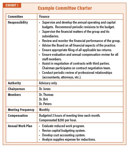 Naturally, the above assumes that the group has done a good job in establishing committees to get group members involved and share the administrative workload. The board should create a committee “Charter” for each committee (an example of such a charter is found in Exhibit 1) and outline: