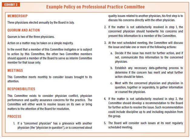 This committee exists to consider physician conflict, physician performance and quality assurance concerns for the practice. The committee will either work to resolve issues on its own or bring matters to the attention of the board for resolution. In most situations, this committee does not have the power to censure or take action against a physician. Instead, it serves as an intermediary step or process to try to resolve the issues before significant steps are taken. A policy for such a committee may be found in Exhibit 2.