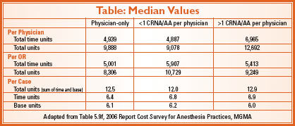 Since 2005, the MGMA has published an annual anesthesia survey entitled “Cost Survey for Anesthesia Practices.”vi In one of the breakdowns of the data, the data is presented by staffing models: physician only, 1 CRNA/AA per physician. The effect of staffing models is seen clearly when one looks at the data in these surveys. From the 2006 report, time and total units per case are almost identical among the three staffing models. (See Table) On the other hand, there is a marked differences between the models (especially between physician-only and >1 CRNA/AA per physician) when looking at time and total units billed per physician. This is not surprising since the medical direction groups bill more than one OR per physician while the physician-only group bills one OR per physician. On the other hand, when one takes the staffing model out of the equation, the work “per OR” shows fewer differences.